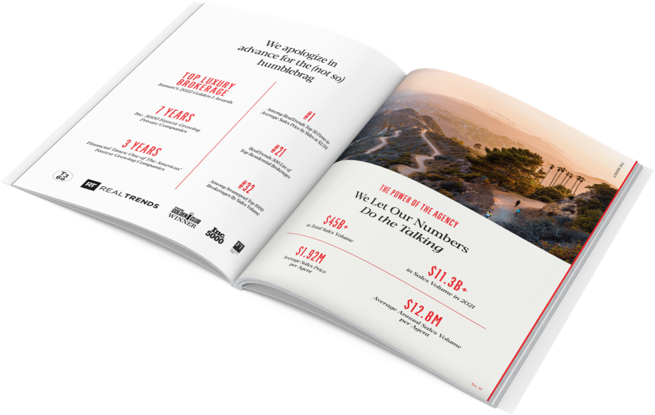 This approach has proven highly successful. Four years after its inception, The Agency was L.A.’s most outstanding real estate brokerage, with 13 of our agents ranked among the top 250 realtors in the United States, as measured by total sales volume by the Wall Street Journal and REAL Trends, Inc. To date, The Agency has closed more than $9 billion worth of real estate transactions and established itself as a preeminent player in the luxury real estate market, representing many of the country’s most visible and high-end properties.